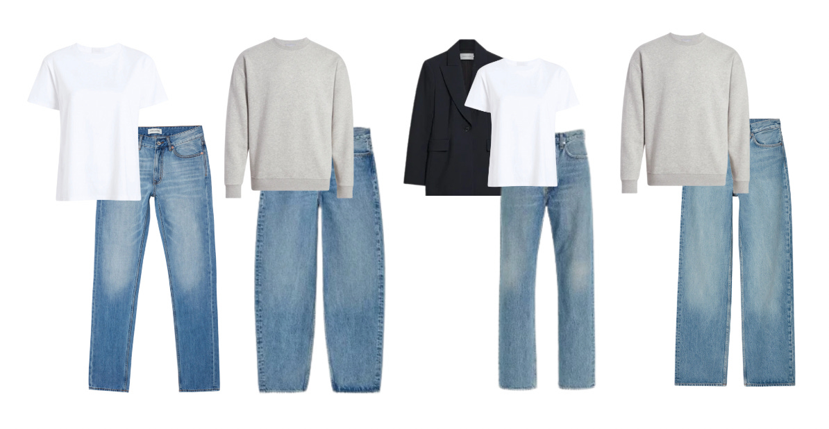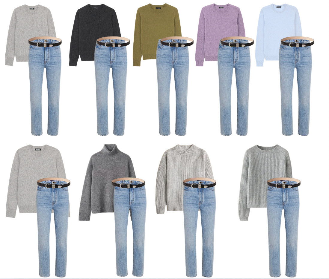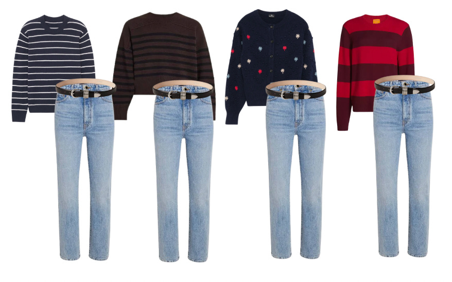 Let’s say your go-to outfit is jeans and a sweater. Taking that outfit formula, let’s apply it to the above examples -
