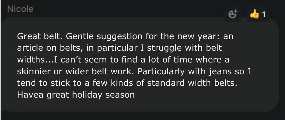 Here’s the thing - I know belts aren’t that deep! I’m sure whatever belt you have, or are wearing, looks just fine so no need to overthink it! But I know a lot of readers read this newsletter because they like learning the how and why behind our wardrobe and styling choices, so let’s get into it!