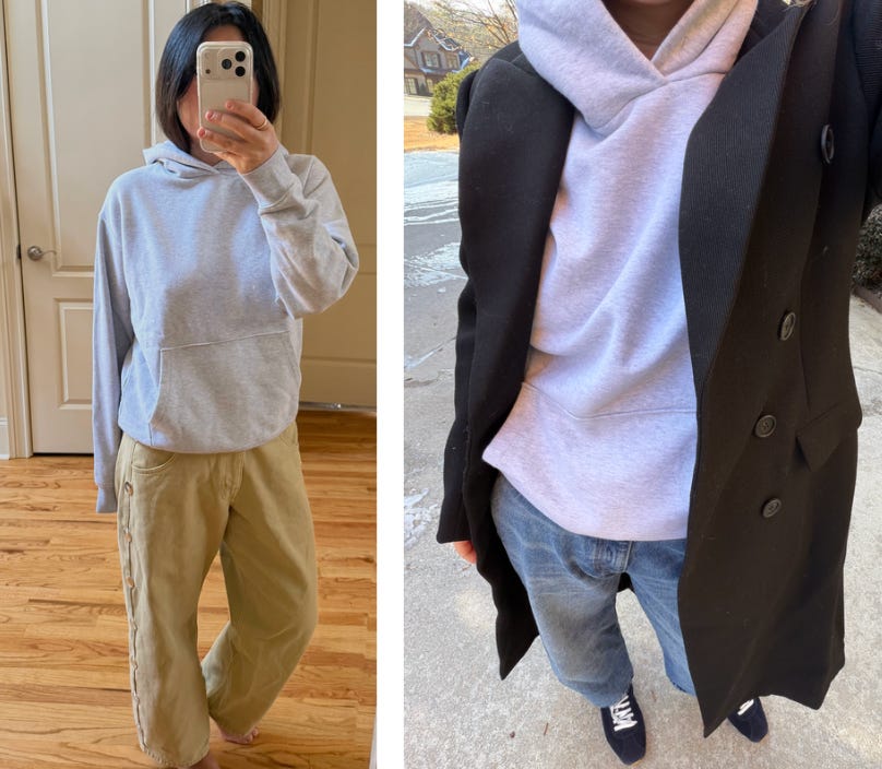One clarity moment I had during the style challenge was that I was in a bit of a sweater and jeans style rut. I always say it’s great to rewear the same things unless you stop feeling good in them. It wasn’t that I didn’t feel good in my sweaters but they were becoming an easy default on busy days and it made me miss the creativity that comes from getting dressed everyday. A simple thing I did was just swap my sweaters for an old hoodie for the week. I only ever wear this hoodie with leggings for workouts so by intentionally styling it with non-workout clothes completely shifted the vibe in my everyday clothes.