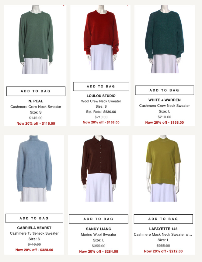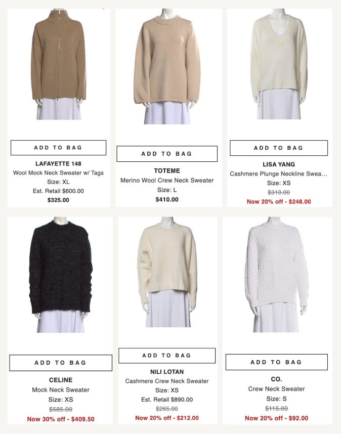 As I need to touch and feel sweaters, I only buy from places I can shop in-person or return if needed. My go-to spot is The RealReal but there’s also a ton of great vintage/secondhand shops on Etsy and social media who are great at providing as much detail as possible so you can make an informed purchase. A lot of brands are starting to resell preloved on their own sites, which I think is a great evolution towards circularity. Apiece Apart, Ralph Lauren Vintage (some incredible rare pieces that’s $$$), Eileen Fisher Renew to name a few (shout out to our reader Becky who highlighted this in our chat!)