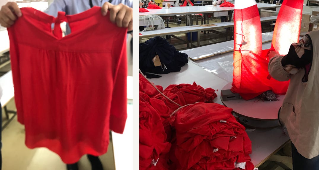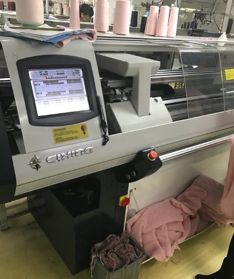 Factory workers inspect each panel and if there’s any snag or missed stitch, it goes through multiple quality control processes such as this one where a panel of fabric is being unraveled to then be re- knit again. (that’s me talking in the video as I was amazed when I first saw this process!)
