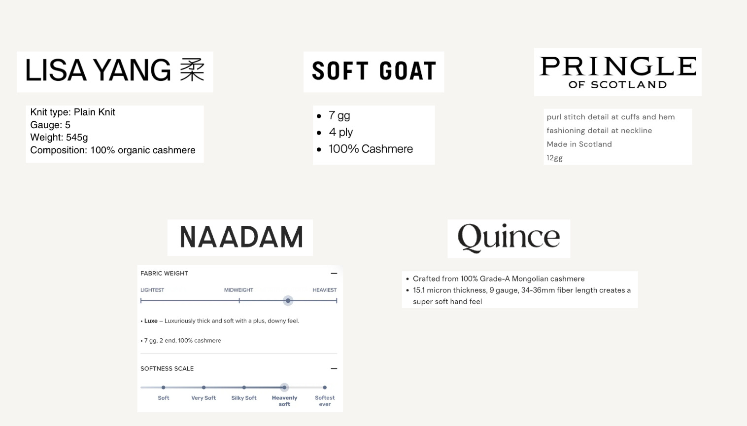 Unfortunately, brands don’t really talk about sweater content. It’s fairly complicated but at the same time, consumers are savvy and want to know what their clothes are made of so I appreciate brands like Naadam and Soft Goat who provide education around their materials.